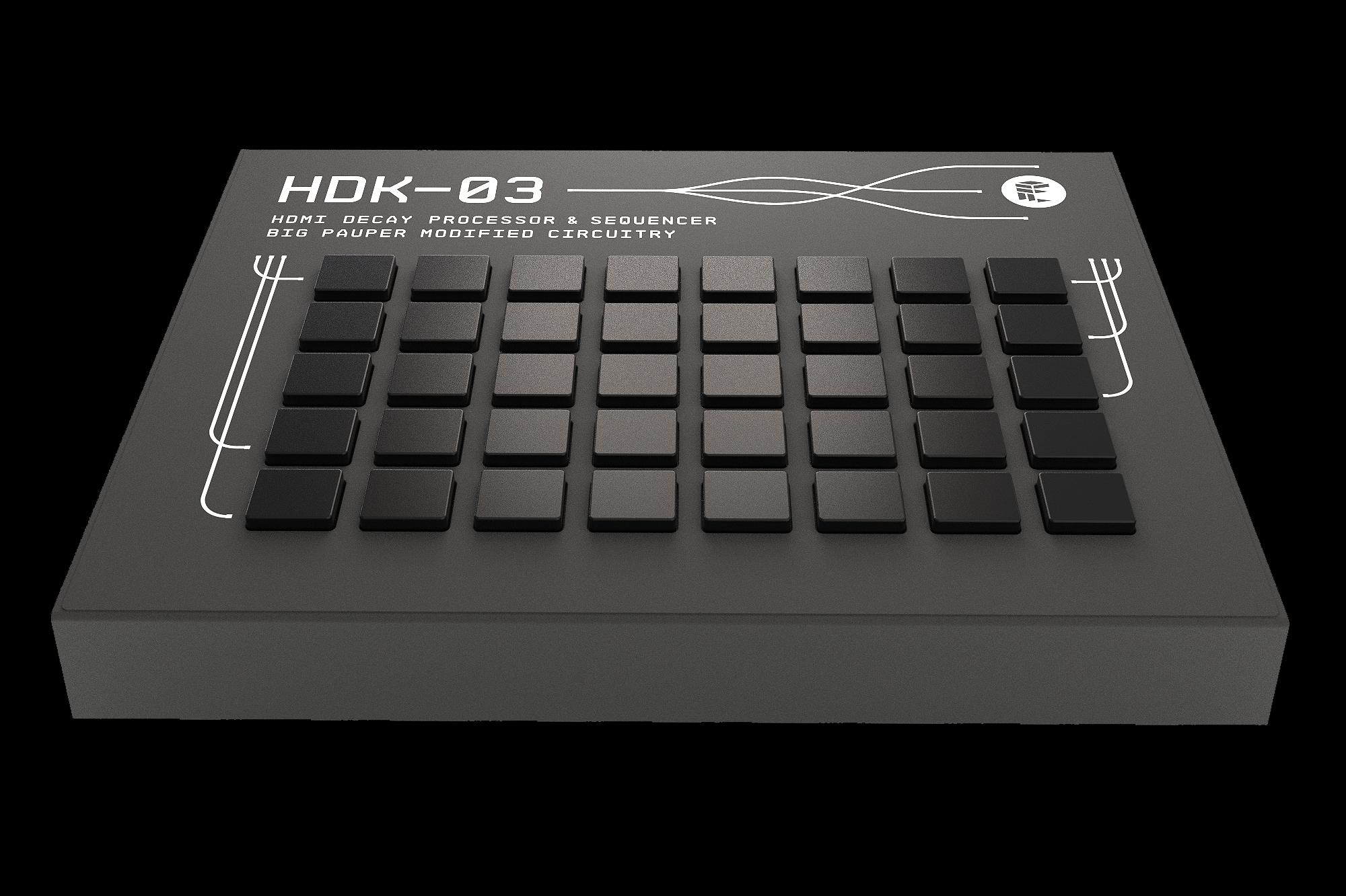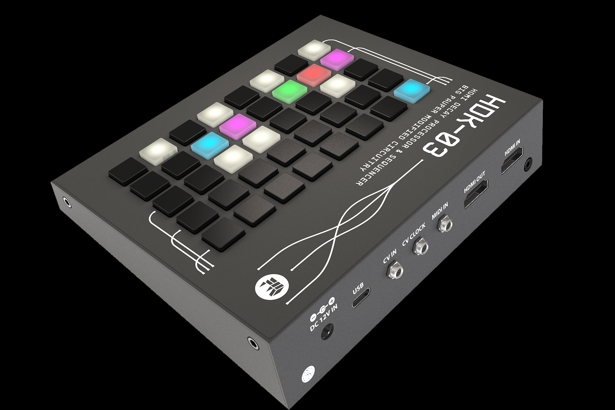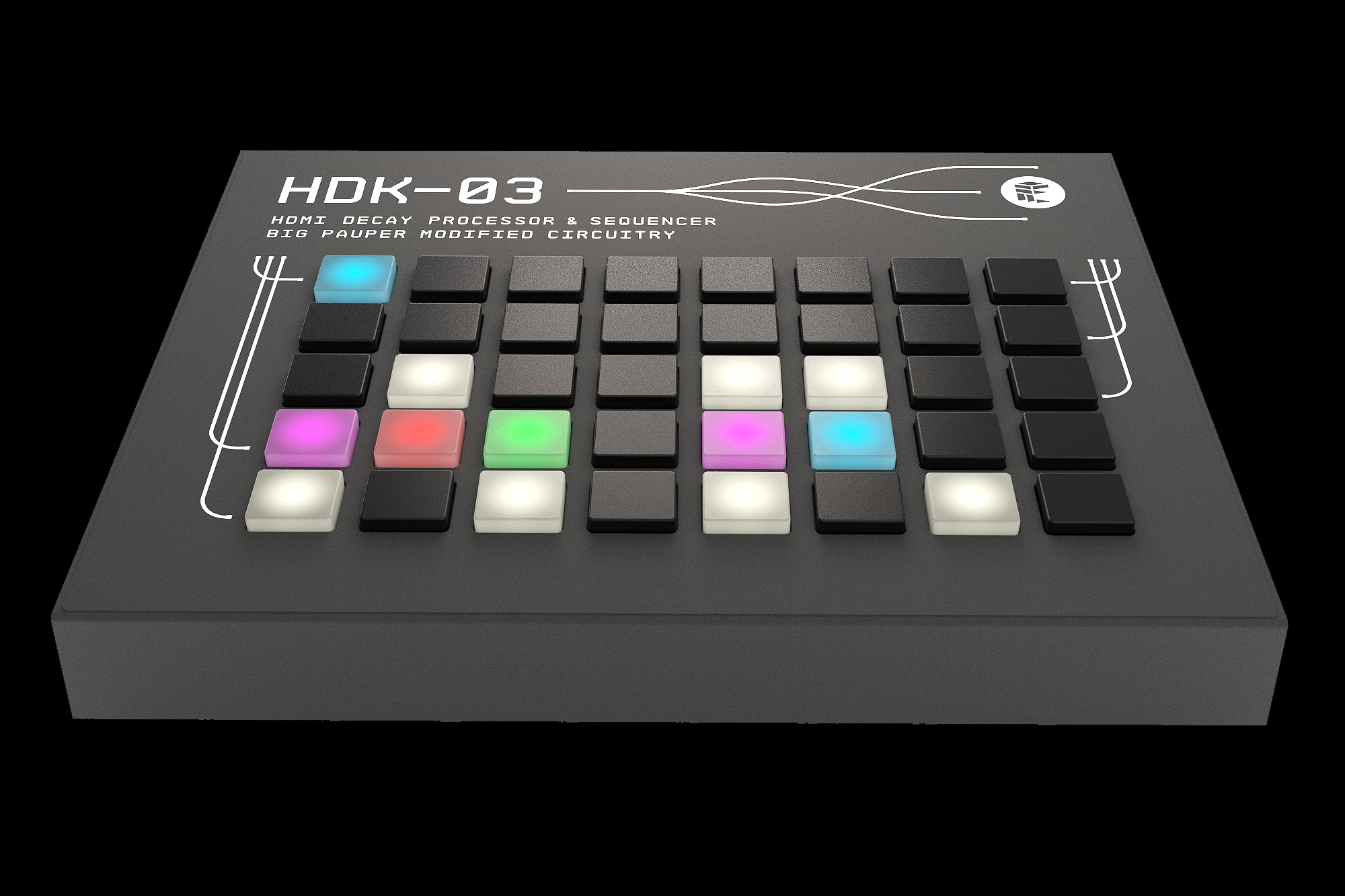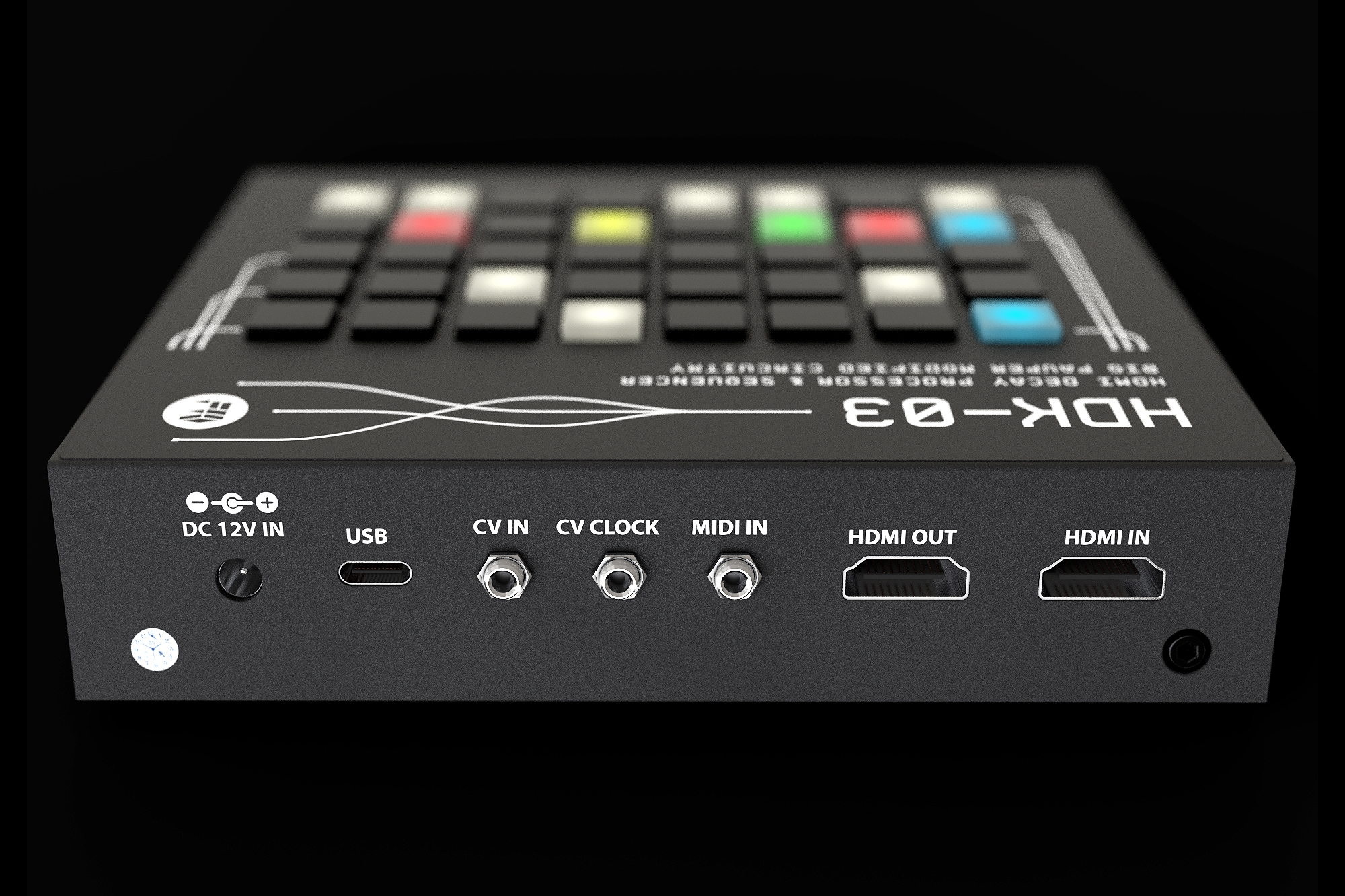 The HDK-03 explores new HD glitch aesthetic territory and delivers on a longtime multimedia dream of mine…. low latency MIDI/CV synched HD visuals. Â The HDK-03 explores a truly primo corrupted scaler environment via two modes of operation. Â First is explore mode. You’ve got 23 points of glitch interactivity to drum on via the soft LED pushbuttons. Â You learn the raw machine underbelly in this mode and become familiar with all the effects the HDK-03 is capable of concocting; delay line glitches, wild color skews, horizontal/vertical fragmentation & digital noise unique to this scaler environment (and the HDK-03). Â Second you’ve got step sequenced mode accessed via the bottom 16 pads. Â Here you set your sequence mode based on either an internal clock, external midi clock or a cv clock signal. Â Working within a one bar loop you hold down a step (pad) to set the corresponding effect you would like on that step. Â With this you build up a full programmed sequence that can be saved and recalled via a multi bank series of presets. Â You’ve got access to 6 banks of presets with 3 sequences available for quick recall at any time. Â The HDK-03 marks a new trajectory in BPMC product development with the focus going forward being on a more multimedia approach.